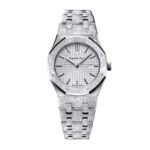 The Royal Oak Frosted Replica from Audemars Piguet is a striking watch. It features a 904L stainless steel case and bezel. both in white gold and gem-set. The crystal is sapphire and the size is 33.00mm. The Royal Oak bracelet is also 904L stainless steel. adjustable for all sizes. and features a folding clasp in white gold. The dial is gem-set and features stick and dot indices. with stick hands in 904L stainless steel.