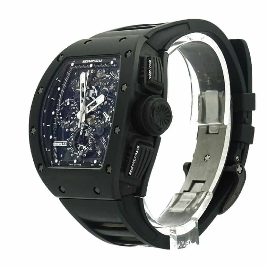 The Richard Mille RM-011 Black Phantom Carbon Fiber Skeleton Dial Replica is a perfect replica of the original watch. It has the same arrangeable serial numbers and cards. font. punto. and finishing for writings and markings. thickness and size. and powerful movement and caliber. It is impossible to tell the difference between the original and the replica. This is the perfect watch for anyone looking for a luxurious watch.